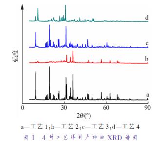 a—工藝 1;b—工藝 2;c—工藝 3;d—工藝 4 圖 1 4 種工藝得到產(chǎn)物的 XRD 譜圖a—工藝 1;b—工藝 2;c—工藝 3;d—工藝 4 圖 2 4 種工藝得到產(chǎn)物的 SEM 照片