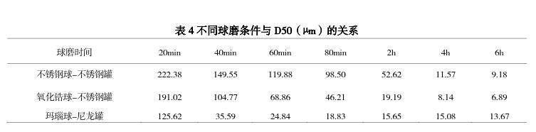 -不銹鋼罐、瑪瑙球-尼龍罐三種研磨材料組合中,超微茶粉粒徑為 35~55µm 時(shí),使用瑪瑙球-尼龍罐球磨的茶樣中鉻和鎳的含量均小于 5.0mg/kg;粒徑為 10µm 以下時(shí),不宜使用不銹鋼球-不銹鋼罐進(jìn)行球磨加工。